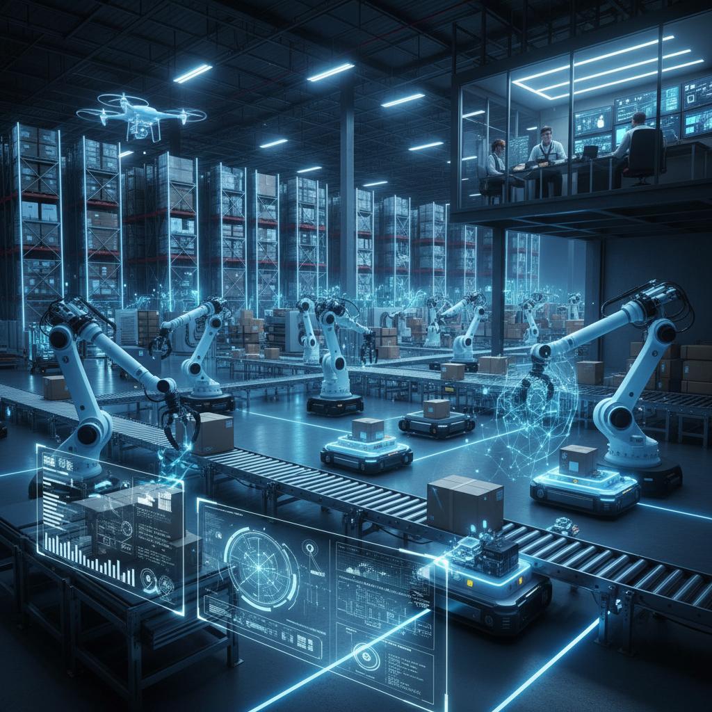 AI-powered system managing warehouse workflow behind the scenes, showing the quiet but profound impact of automation.