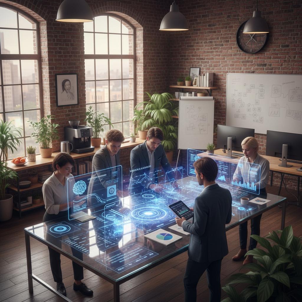 Futuristic, editorial image: AI-powered workspace with holographic dashboards and diverse professionals, symbolizing next-gen innovation environments