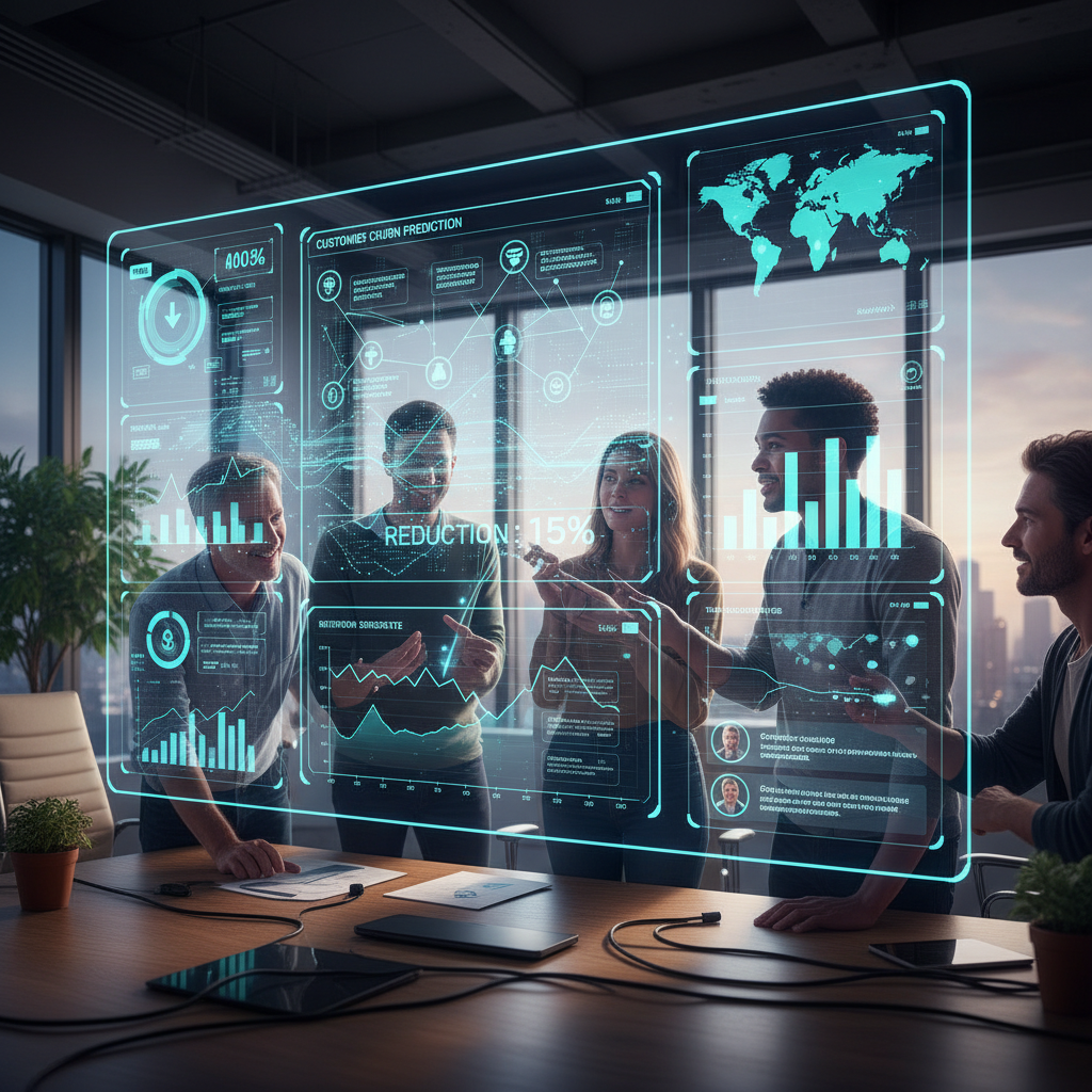 Editorial image: A business team watches an AI-driven dashboard surface churn alerts, fueling a turnaround.