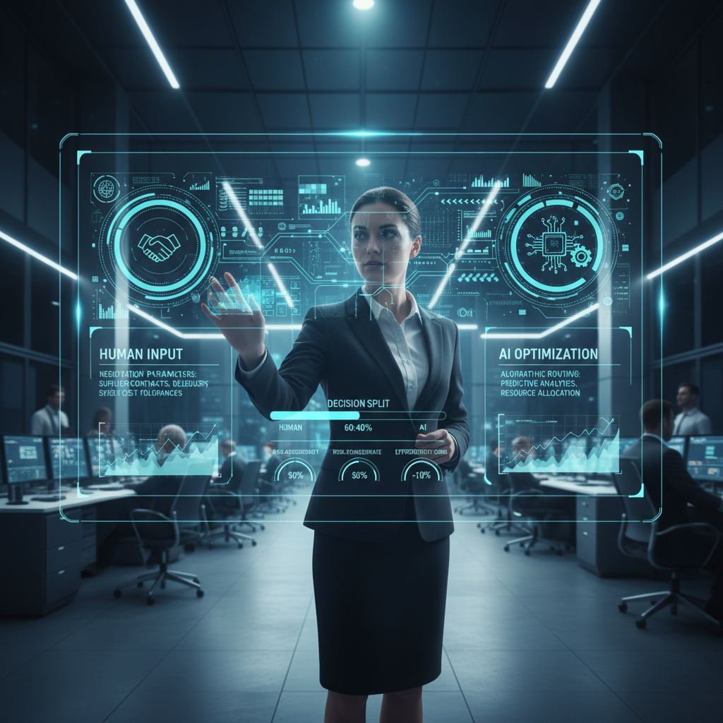 Visual juxtaposition of an AI dashboard and a human negotiator, capturing the essence of human-AI collaboration in logistics.