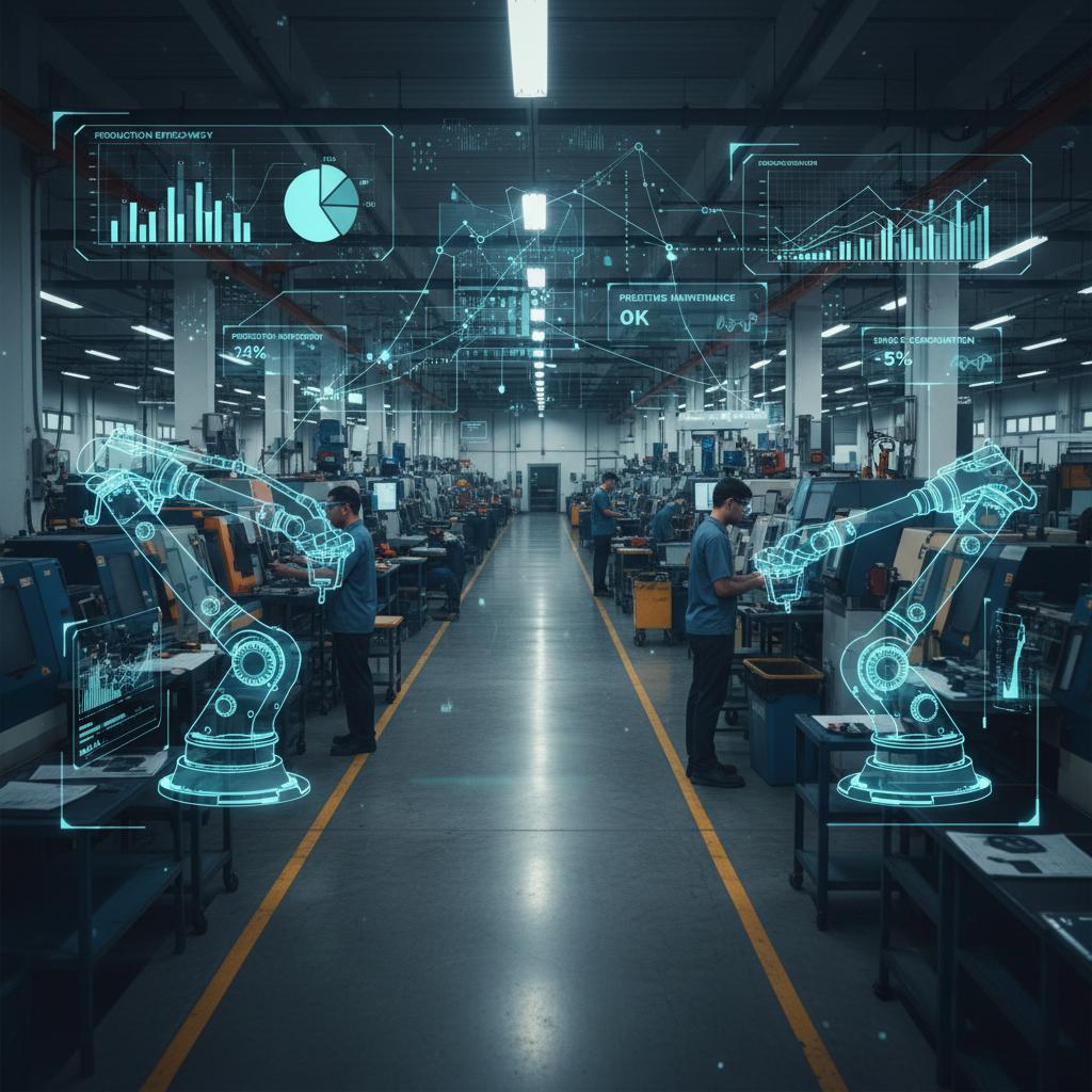 Alt text: Busy manufacturing factory floor enhanced by AI-driven operational analytics platforms, showing digital overlays and human workers collaborating.