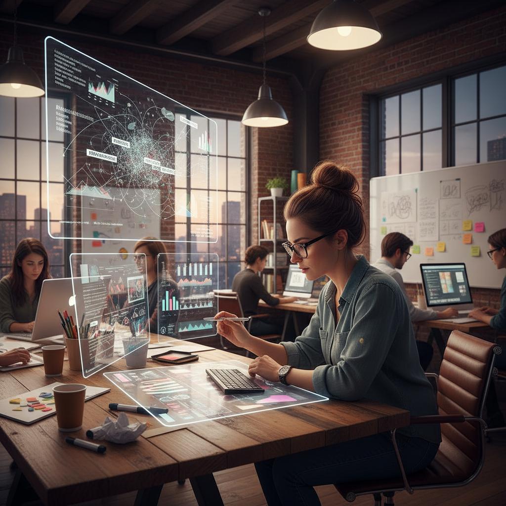 Narrative photo: Creative professional exploring AI-powered portfolio data visualizations in an innovative workspace (SEO keywords: AI-driven investing, creative industries, data visualization)