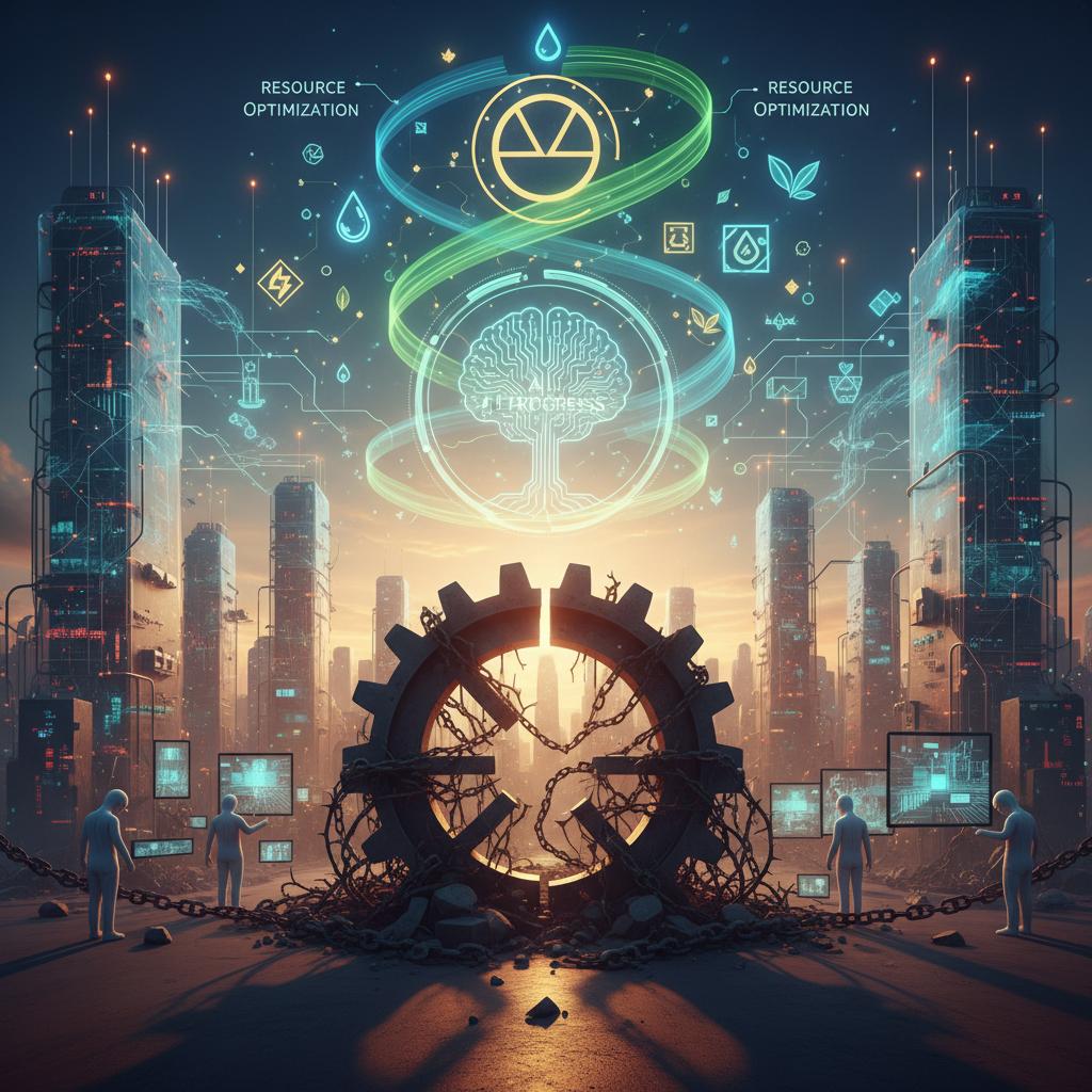 Alt text: Abstract visualization showing AI gears and neural paths, symbolizing complex AI-driven resource optimization software logic and advantages.