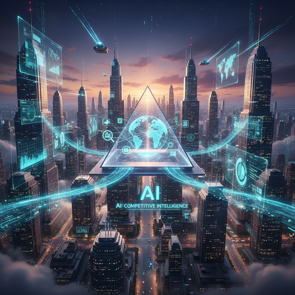 Alt: Futuristic city at dusk, overlaid with data visualizations, symbolizing the evolving landscape of AI-powered competitive intelligence analytics.