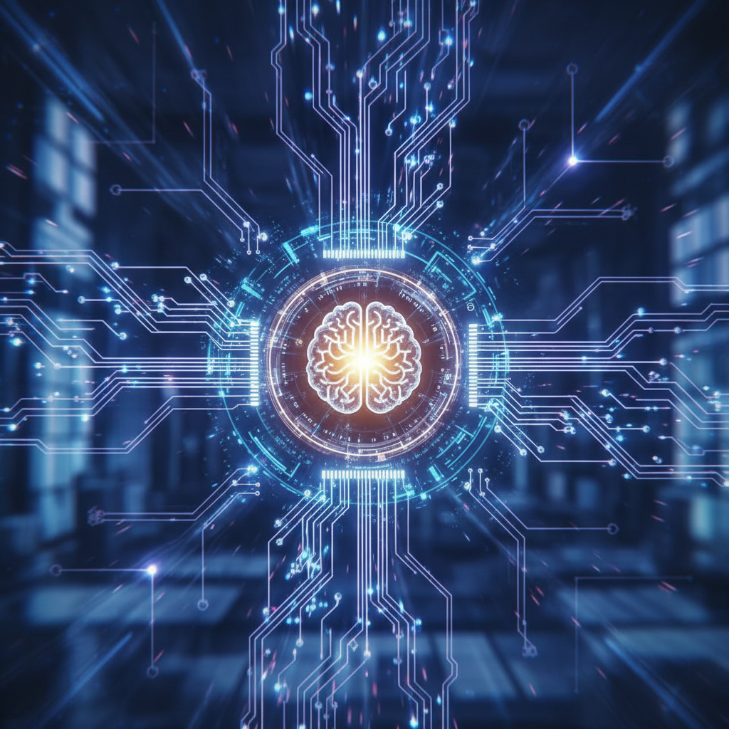 AI-powered technology visualized as a brain-like circuit, blending silicon and perception.