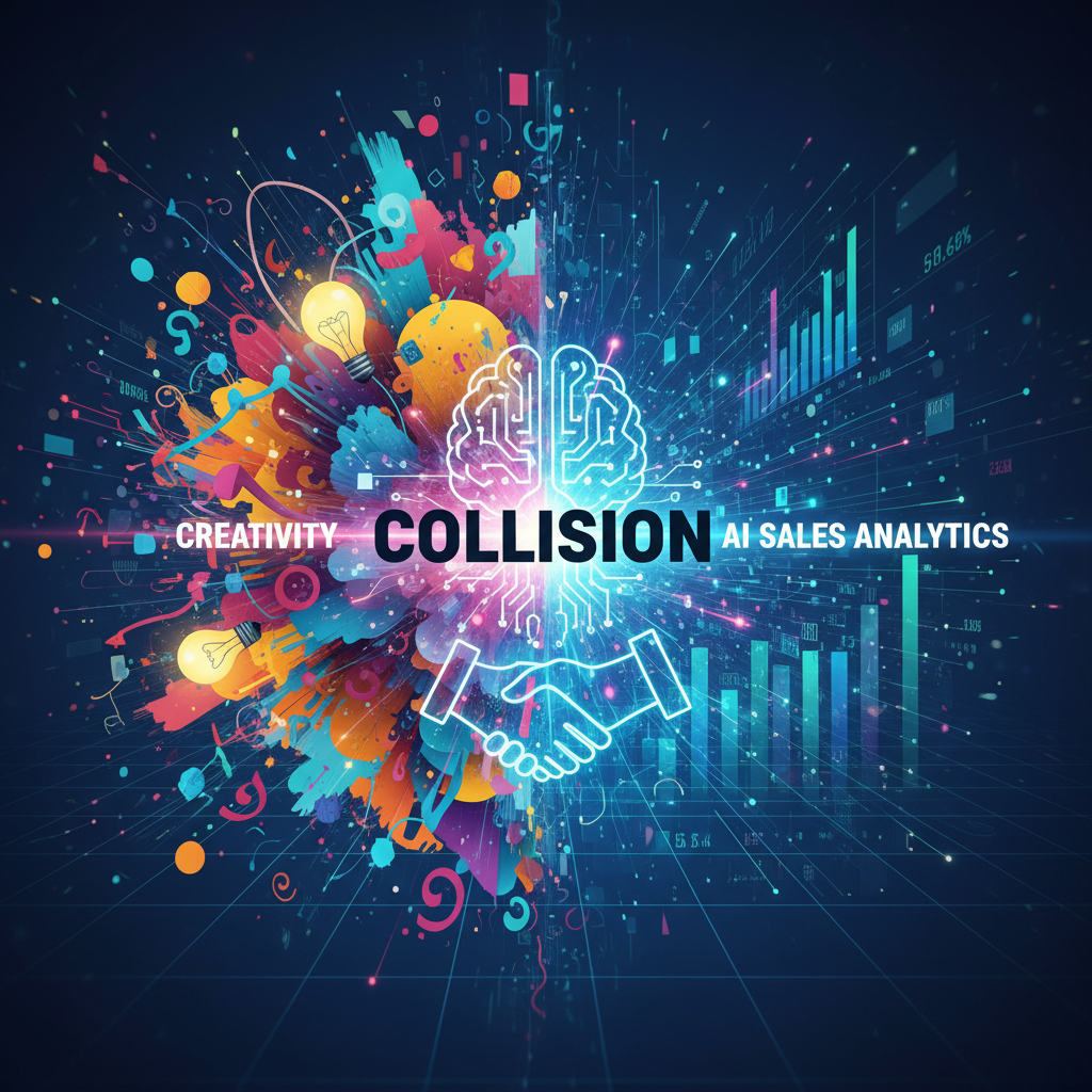 Alt text: The collision of creativity and AI in sales, creative and technical elements merging in a dynamic collage.