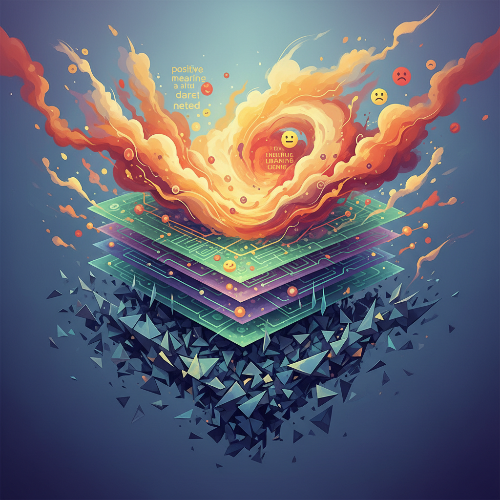 Macro shot of code and algorithm layers visualized as abstract art, illustrating machine learning sentiment detection.