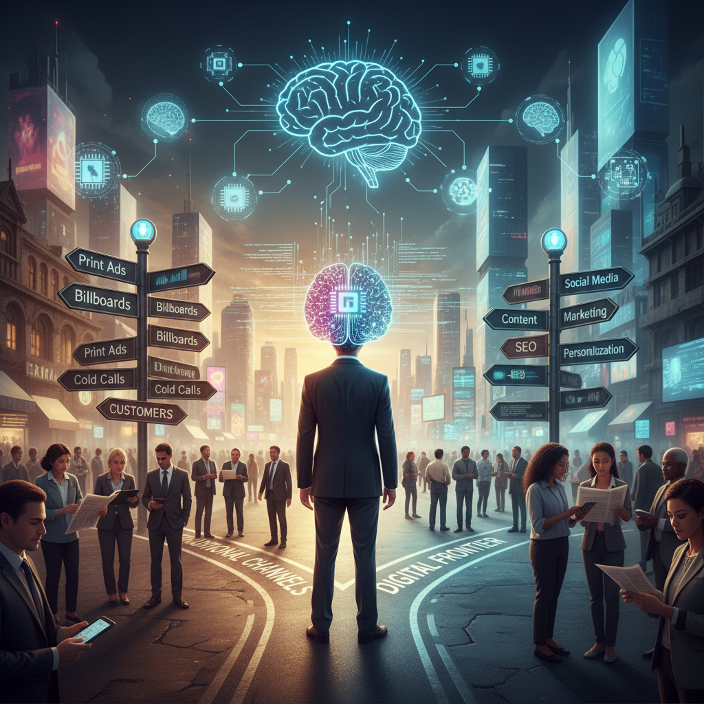 Descriptive alt text: Atmospheric photo of a marketer standing at a crossroads, one path leading to a glowing AI brain, the other to a crowd of engaged customers, symbolizing decision-making in the era of automated targeted marketing software.