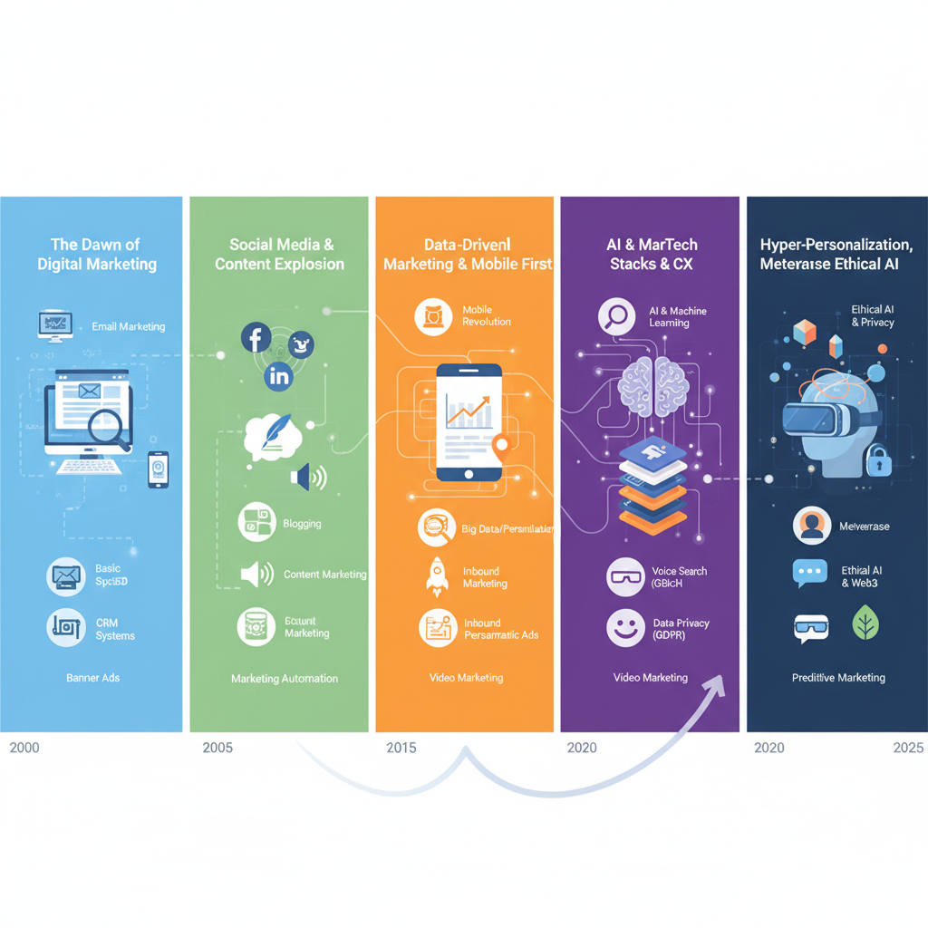 Descriptive alt text: Photo timeline of marketing technology from spreadsheets to AI automation, with people, computers, and urban office backgrounds. Keywords: marketing technology, AI-powered software, data-driven marketing.