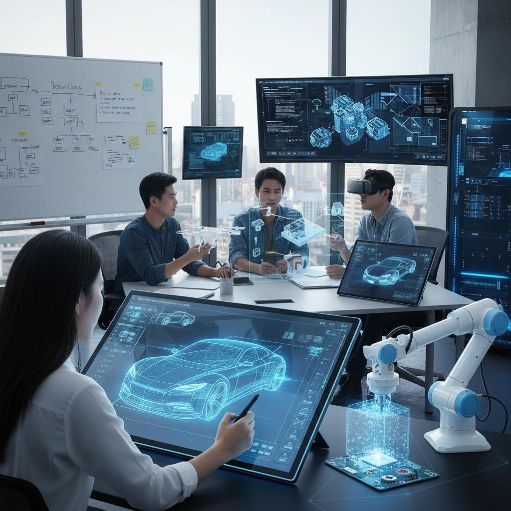 Alt text: Diverse team working together on digital product with AI automation tools visible, workflow automation in action