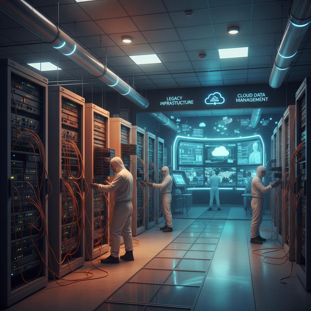 Photo: Gritty contrast between outdated server rooms and rising digital cloud platforms, symbolizing the transition in business data management solutions online.