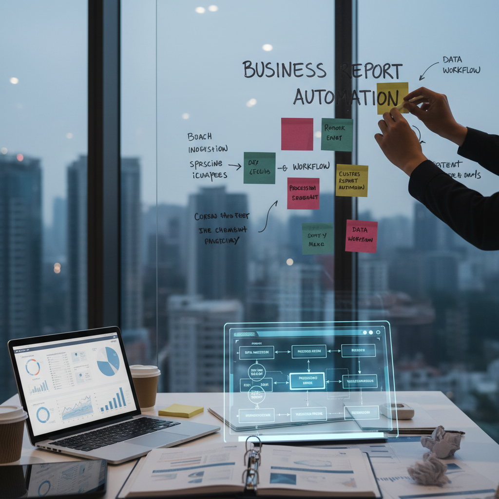 Alt: Analyst brainstorming with colorful sticky notes and a tablet, relaxed team vibe, showcasing benefits of automating business reporting.