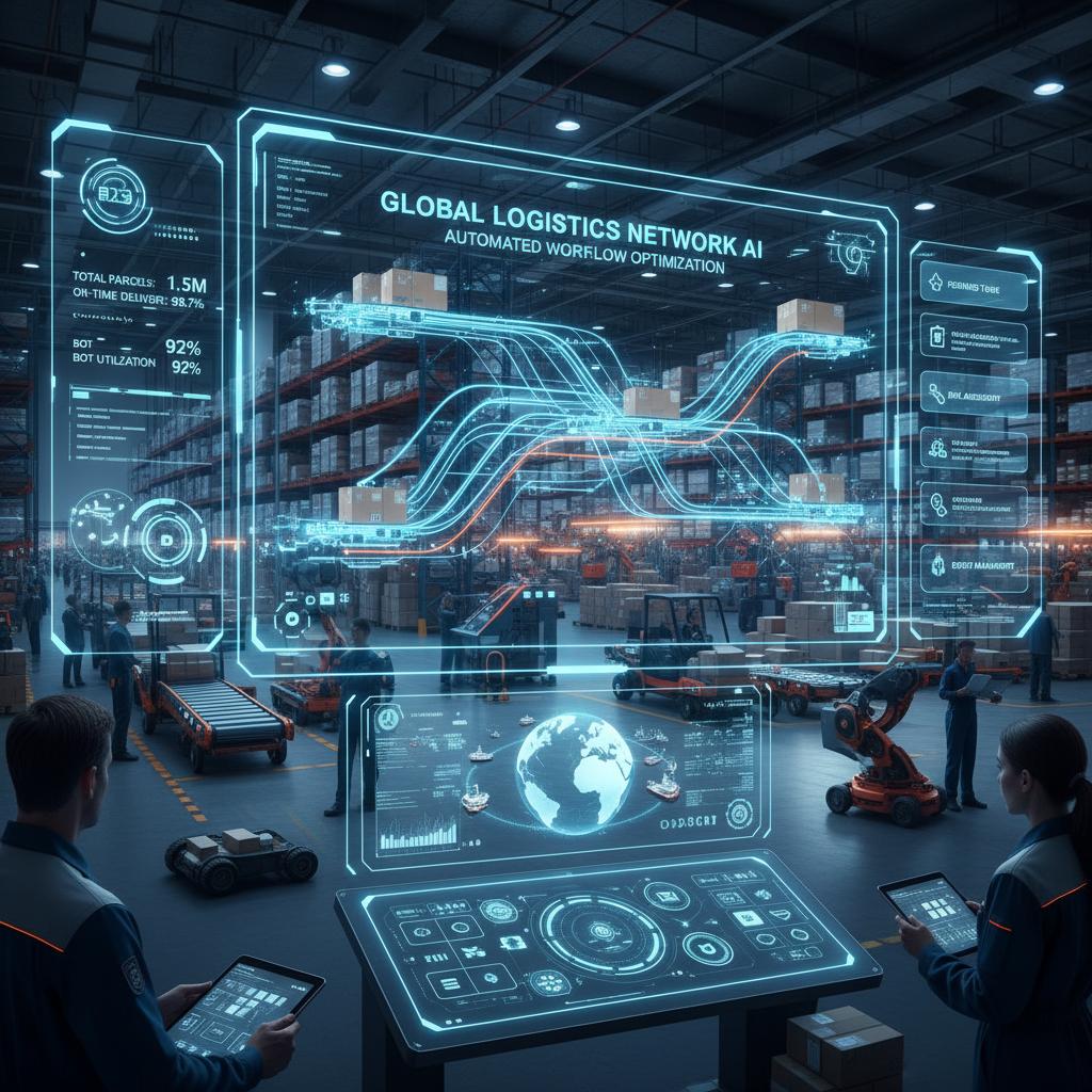 Alt: AI-powered workflow automation in action, with digital overlays in a logistics hub, showcasing operational workflow automation software