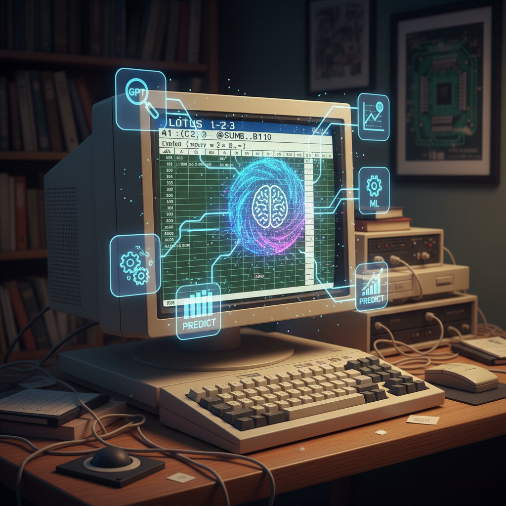 Alt text: Photo showing vintage spreadsheet software on an old computer beside a modern AI dashboard, highlighting evolution of business tools and spreadsheet management inefficiencies.